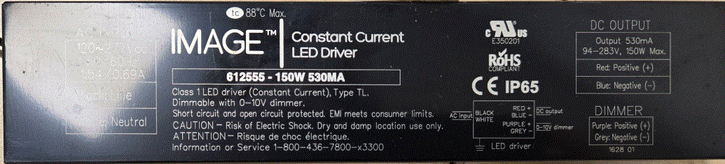 XI180C180V144BSF1 180W PROGRAMMABLE LED DRIVER 120V-277VAC-IN 50V-144VDC-OUT 100mA-1800mA RANGE DIMMABLE 0-10V SIMPLESET W/GREEN GROUND L 9.47" W 2.31" H 1.48" 2.1LBS ***IN HOUSE CUSTOM PROGRAMMING*** |