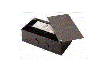 EM600S12AC 600W OUTDOOR BLACK POWDER COATED STEEL ENCLOSED MAGNETIC TRANSFORMER 120VAC/IN 12/24VAC/OUT 6-KNOCKOUTS 2-CIRCUITS, EACH 300W 9.4"H X 4.6"W X 4.1"D 18.0LBS EA |