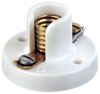 LEVITON-10091 MEDIUM BASE SOCKET- E26- PORCELAIN- FLAT STEEL CAP WITH FEMALE THREADED BUSHING SET AT ANGLE AND FITTED WITH SCREW SET |