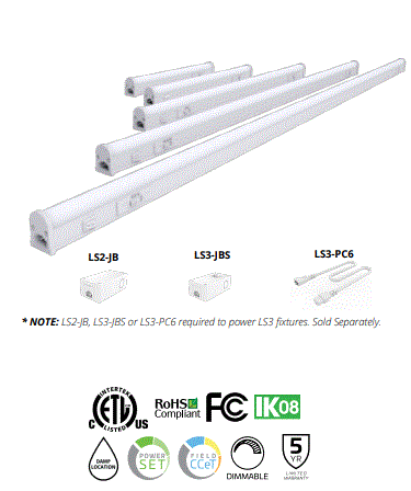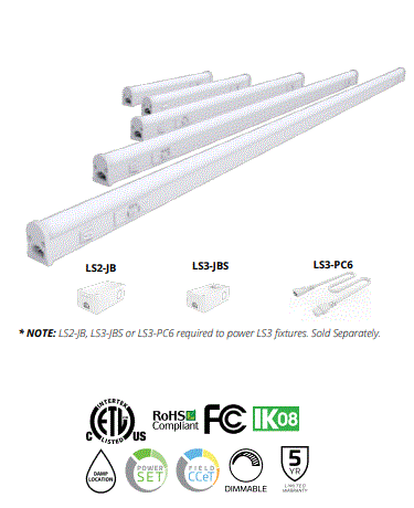 LS3-PS4718-FCCT DUAL SELECT 47" LINEAR UNDER CABINET STRIP LINKABLE FIXTURE 12W/15W/18W =28W T5 HE 120V 2700K/3000K/3500K/4000K/5000K CRI>80 1320KM/1650LM/1980LM TRIAC DIMMING DIM-TO-OFF PF:>0.90 120D BEAM ANGLE 50000HRS WHITE FINISH L 46.50" W 1.40" 2.01LBS |