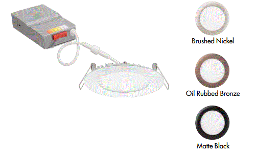 WF4-SWW5-90CRI-MB-M6 9W LED 4" WAFER THIN DOWNLIGHT 120V CCT-SELECTABLE 2700K 3000K 35000K 4000K 5000K CRI>90+ 690LM TRIAC DIMMING TO 10% T24-COMPLIANT WET LOCATION RATED ENERGY STAR RATED 50000HRS MATTE WHITE FINISH D 5.00" H 1.20" 1.15LBS |