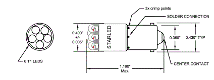 SSB-1001-6NW 6V T3-1/4 LED LAMP BA9S-MINIATURE BAYONET BASE 6-CLUSTER ULTRA PURE GREEN 520nm-530nm (UTILITY) L 1.19" D 0.40" |