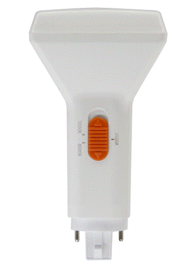 LED9.5PBG24QHDIM8SC1SUB 9.5W PLASTIC LED DULUX PL G24Q/GX24Q- 4 PIN BASE =CF26DD/E HORIZONTAL BURN TYPE A-BALLAST COMPATIBLE CCT SELECTABLE 3000K/3500K/4100K CRI>80+ 960LM/1020LM/1050LM 120D BEAM ANGLE 0-10V DIMMING THRU BALLAST 50000HRS L 6.35" D 1.31" |
