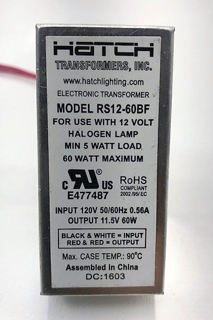 RS12-60BF 60W ELECTRONIC LOW VOLTAGE TRANSFORMER 120VAC-IN TO 12VAC- OUT BOTTOM FEED LEADS 5W MIN LOAD L 2.2" W 1.23" H 0.75" |