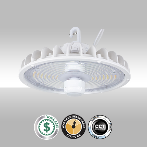 BPHE3-U090WCS 90W 120W 150W LED HIGH BAY DUAL SELECTABLE 120-277V 3500K 4000K 5000K 80CRI 12,150LM-21,900LM DIMMABLE 0-10V 90D BEAM ANGLE W/ HOOK MOUNT 100,000HRS WHITE FINISH 10.43"DIA 6.85"H |