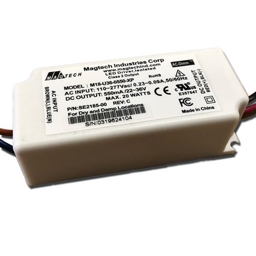 M18-U36-0550 18W LED DRIVER CONSTANT CURRENT CC 110-277VAC-IN 21-36VDC-OUT 500mA 18W MAX DIMMABLE ELV TRAILING EDGE 100,000HRS L 3.36" W 1.5" H 1.09" |