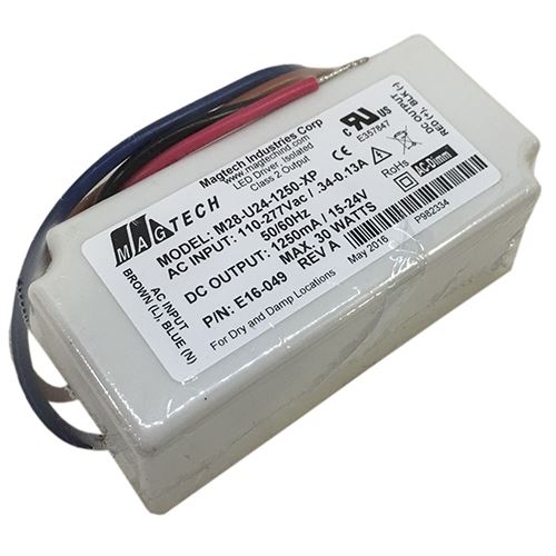 M28-U24-1000-XP 30W LED DRIVER CONSTANT CURRENT CC 100-277VAC-IN 15-24V-OUT 30W MAX 1250mA MAX DIMMABLE COMPATIBLE WITH ELV TRAILING EDGE AND ELECTRONIC LOW VOLTAGE DIMMERS 100,000HRS |