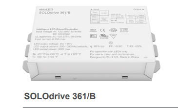 SL0361B2-450MA-LIN SOLOdrive CC PROGRAMMABLE LED DRIVER 361/B2 30W 100-277VAC/IN, 2-55VDC/OUT 1-OUTPUT (UL CLASS 2) 1 CONTROL CHANNEL PROGRAMMED TO 450mA PF:>0.90, 0-10V DIMMING, BOTTOM FEED , METAL SQUARE W/FEET 50000HRS 5.12"L X 2.83"W X 1.35"H 0.63LBS EA |