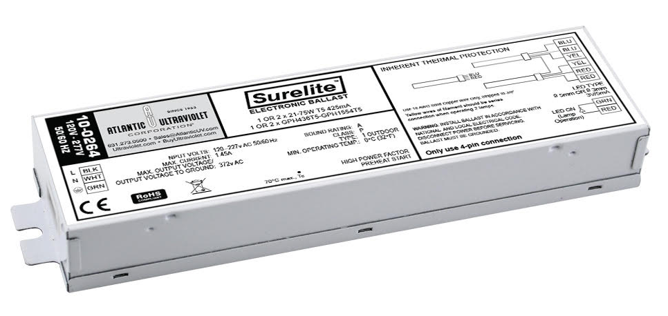 10-0161 1L OR 2L SURELITE ELECTRONIC UV BALLAST 120V - POWERS DOUBLE ENDED SINGLE PIN AND BI-PIN UV LAMPS OUTDOOR RATED INSTANT START 1L GPH212T5- 2L G12T5- 1L GPH330T5- 2L G10-1/2 1L GPH357T5- 2L G18T5- 1L GPH436T5- 1L GPH463T5- 1L GPH550T5 2L G24T5- 1L GPH620T5/4 EB-IS-35-1-5/6-0 50/60 Hz. |