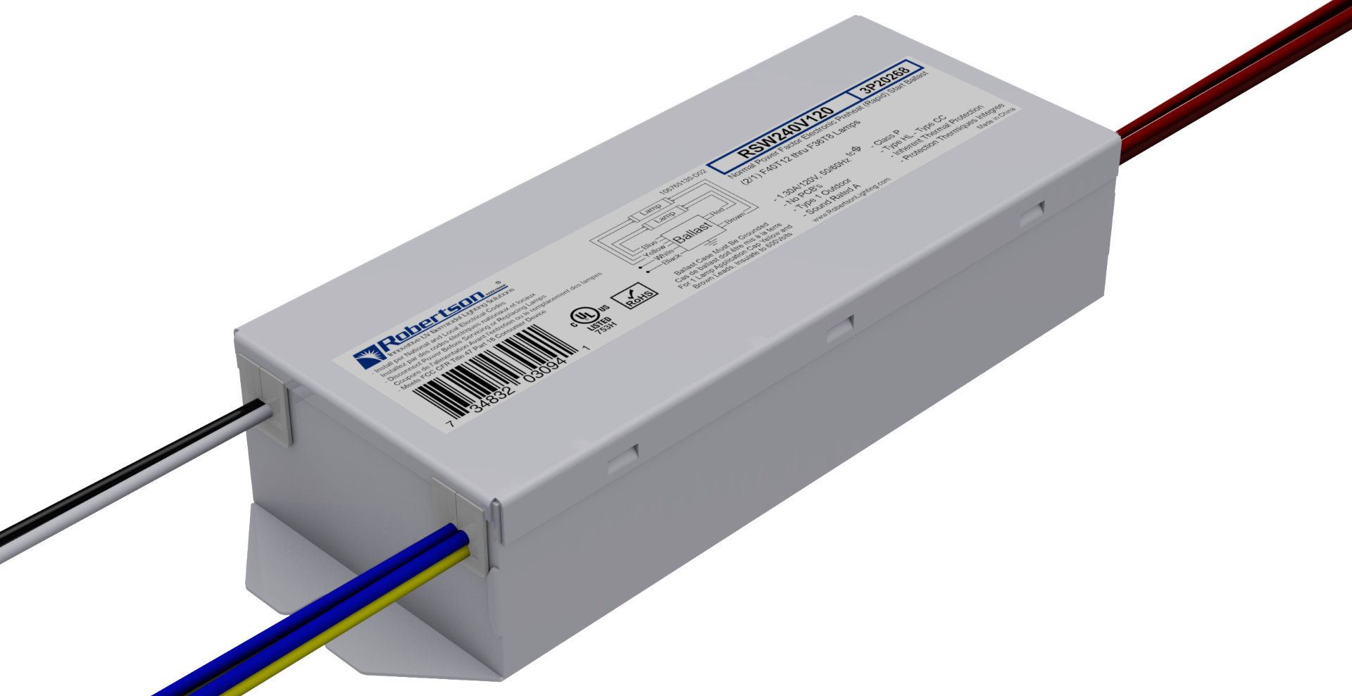 RSW240V120 1L/2L 36W 40W UV ELECTRONIC BALLAST 120VAC/IN PREHEAT RAPID START SOUND RATED A TYPE 1 OUTDOOR L 6.46" W 2.28" H 1.26" 0.90LBS |