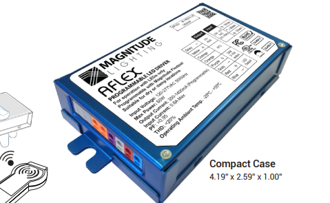 AFLEX-60W-1400-S-LA 60W CC-CONSTANT CURRENT PROGRAMMABLE LED DRIVER COMPACT SIZE 120V-277VAC/IN 100mA-1400mA 3V-57VDC/OUT W/12V AUX @ 80mA DIMMABLE 0-10V SIDE LEAD EXIT IP40 4.95"L X 2.59"W X 1.00'H T24/COMPLIANT **IN-HOUSE PROGRAMMING MUST HAVE WATTAGE AND mA FOR PROGRAMMING** |